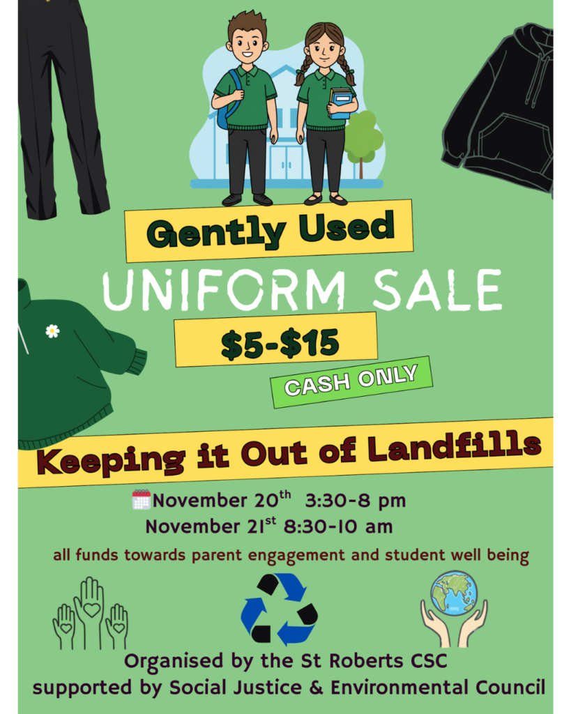The St. Robert Catholic School Council is happy to host a Gently Used Uniform Sale. The sale will take place during Parent Teacher Interviews on Nov. 20-21, 2025. Please bring cash. Pieces as low as $5.